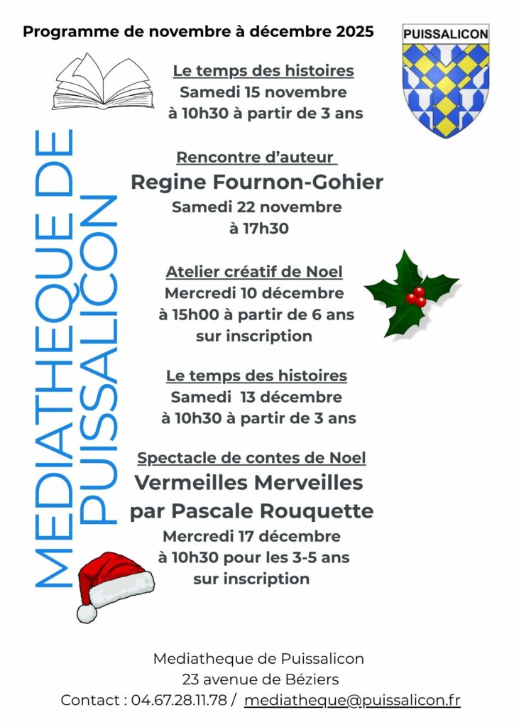 Pour cette fin d’année, la médiathèque de Puissalicon propose différentes animations pour petits et grands : le Temps des histoires à partir de 3 ans , un atelier créatif à partir de 6 ans sur inscription et deux grands événements…