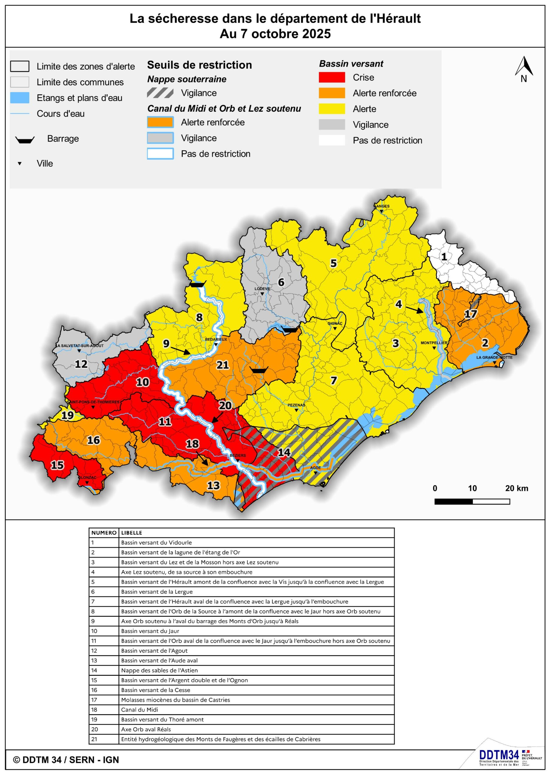 Pour plus d’information sur l’arrêté en cours, ainsi que sur la situation de votre commune, vous pouvez vous rendre sur le site Internet des services de l’Etat, où vous trouverez les documents de référence sur la sécheresse (dont arrêté cadre sécheresse DDTM34-2025-04-15839 du 22 avril 2025) et le point de situation au 14 octobre 2025 (arrêté accompagné de la carte des zones d’alerte).