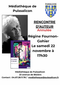 la rencontre d’auteur avec Régine Fournon-Gohier, le samedi 22 novembre à la Médiathèque à 17 h30 est malheureusement annulée.