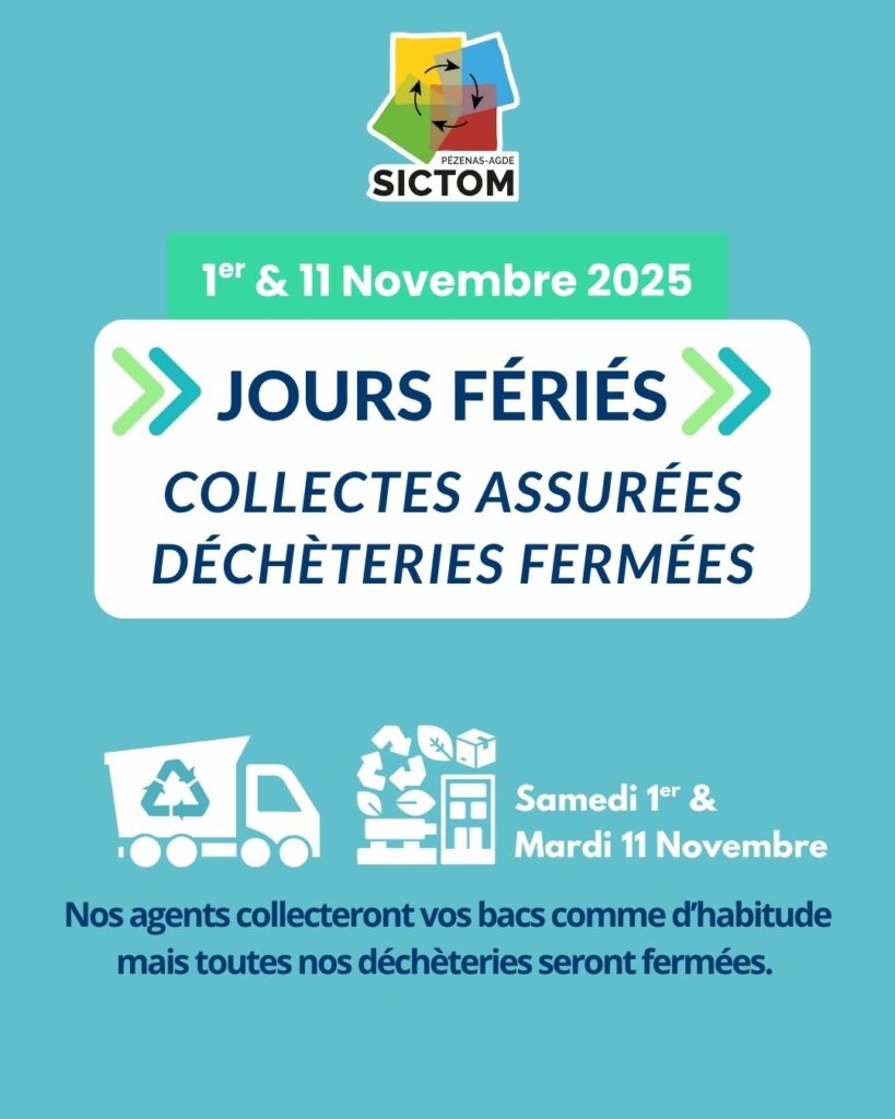 SICTOM Pézenas-Agde – information jours fériés le 1er et le 11 novembre 2025 JOURS FÉRIÉS Information pour le samedi 1er et mardi 11 novembre Toutes les collectes prévues dans les communes seront assurées. Toutes les déchèteries seront fermées.