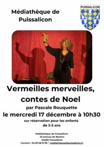 La médiathèque propose un spectacle de contes de Noel, Vermeilles Merveilles par Pascale Rouquette, pour les 3-5 ans, le mercredi 17 décembre à 10h30 sur réservation au 04 67 28 11 78 ou par mail à mediatheque@puissalicon.fr