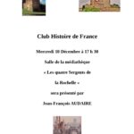 Le club d'Histoire de France propose le mercredi 10 décembre à 17h30, un exposé sur "Les quatre sergents de la Rochelle" par Jean-François Audaire, à la salle de la médiathèque.