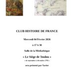 Nouvelle rencontre du Club d’Histoire de France, le mercredi 4 février à 17h30 Posted on 28 janvier 2026 by communication Le club d'Histoire de France vous propose le mercredi 4 février à 17h30, à la salle de la médiathèque, une rencontre sur "Le Siège de Toulon". Read More