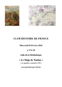 Le club d’Histoire de France vous propose le mercredi 4 février à 17h30, à la salle de la médiathèque, une rencontre sur « Le Siège de Toulon ».
