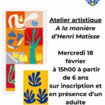 un atelier artistique à la manière de Matisse aura lieu le mercredi 18 février à 15h00 accessible dès 6 ans sur inscription au 04 67 28 11 78 et en présence d'un adulte.