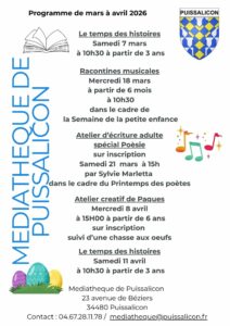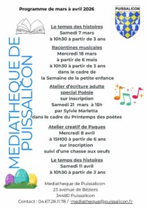 Pour mars/ avril 2026, la médiathèque de Puissalicon propose différentes animations pour petits et grands : le Temps des histoires à partir de 3 ans , un atelier créatif à partir de 6 ans sur inscription et un atelier d’écriture spécial poèsie pour les adultes dans le cadre du Printemps des poètes…