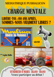 Le vendredi 6 mars de 18h à 19h, la médiathèque de Puissalicon accueille une conférence-débat sur le thème de la charge mentale à l’occassion de la Journée de la femme par l’association L’atelier des frangines.