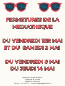 La médiathèque vous annonce ces jours de fermetures en mai en raison de jours fériés : 1er mai, 2 mai, 8 mai et 14 mai.