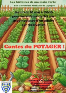 la médiathèque propose le mercredi 20 mai à 10h30, le spectacle Les contes du potager par Mathilde de Lapeyre pour les enfants de 3 à 6 ans, sur réservation et accompagnés d’un adulte.