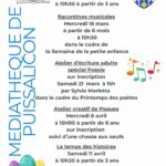 Pour mars/ avril 2026, la médiathèque de Puissalicon propose différentes animations pour petits et grands : le Temps des histoires à partir de 3 ans , un atelier créatif à partir de 6 ans sur inscription et un atelier d'écriture spécial poèsie pour les adultes dans le cadre du Printemps des poètes...
